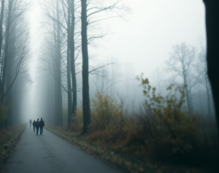 Herfst, zondagmiddag. Grijze lucht hangt neer met een mistige stilte, zo stil dat ik haar bijna kan aanraken. Alles voelt versteend alsof iemand op een pauzeknop heeft gedrukt. Toch zie ik in de dreef van het bos nogal wat mensen slenteren. Hun uitdrukkingsloze gezichten vertellen me niets. Hun passen zijn hetzelfde, stap na stap, alsof ze allemaal aanvaard hebben dat er op deze weg geen zijsprongen meer zijn, alleen dit ene pad.